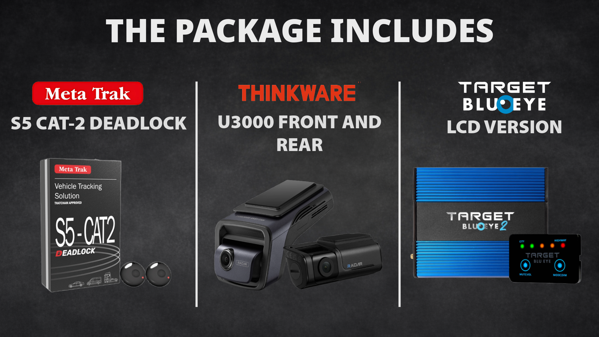 Meta Trak S5 CAT-2 Deadlock, Thinkware Dash Cam U3000 Front & Rear and Target Blu Eye 2 (LCD Version)