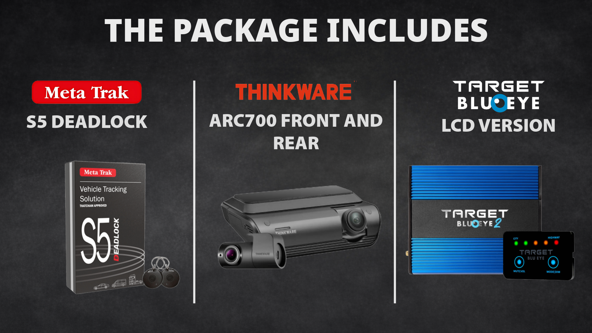 Meta Trak S5 Deadlock, Thinkware ARC700 2 CH Hardwire and Target Blu Eye 2 (LCD Version)