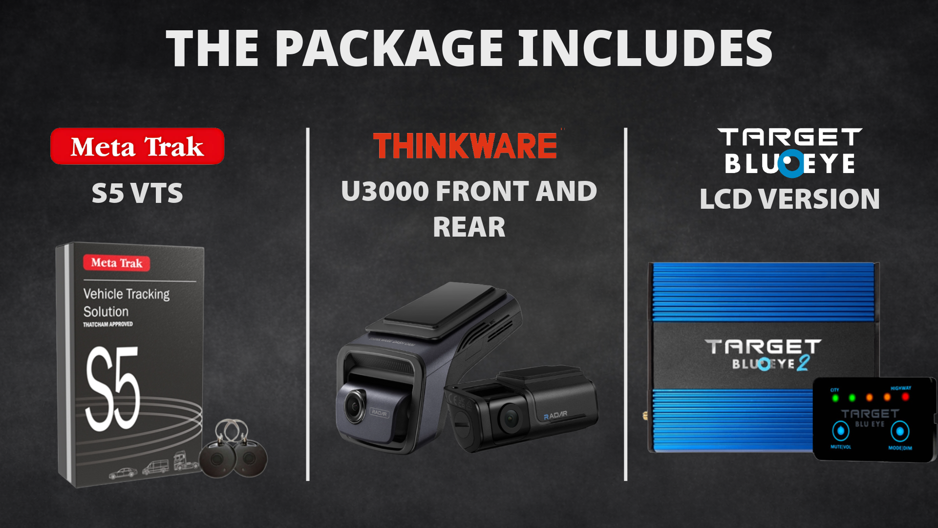 Meta Trak S5 VTS, Thinkware Dash Cam U3000 Front & Rear and Target Blu Eye 2 (LCD Version)